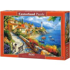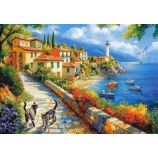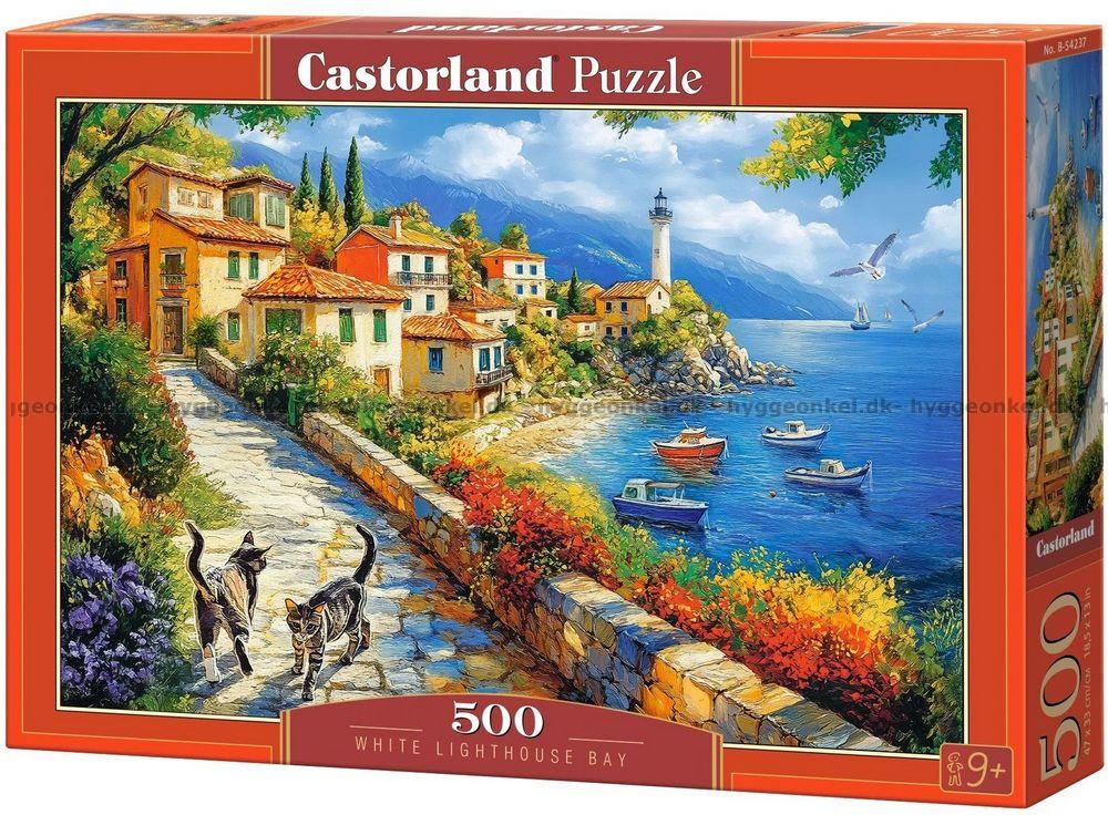 - Et hvitt fyrtårn står på en klippe, mens små båter vugger i det klare vannet