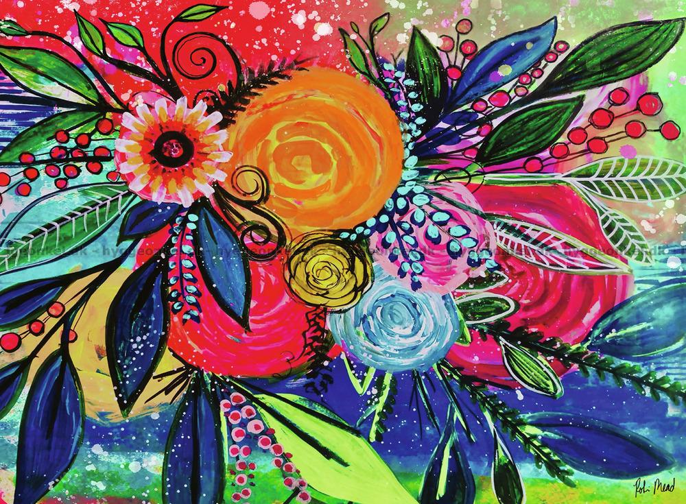 - Store, runde blomster i oransje, gul, blå og rosa, omgitt av mange forskjellige blader og bær i grønne, blå og røde nyanser