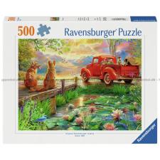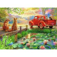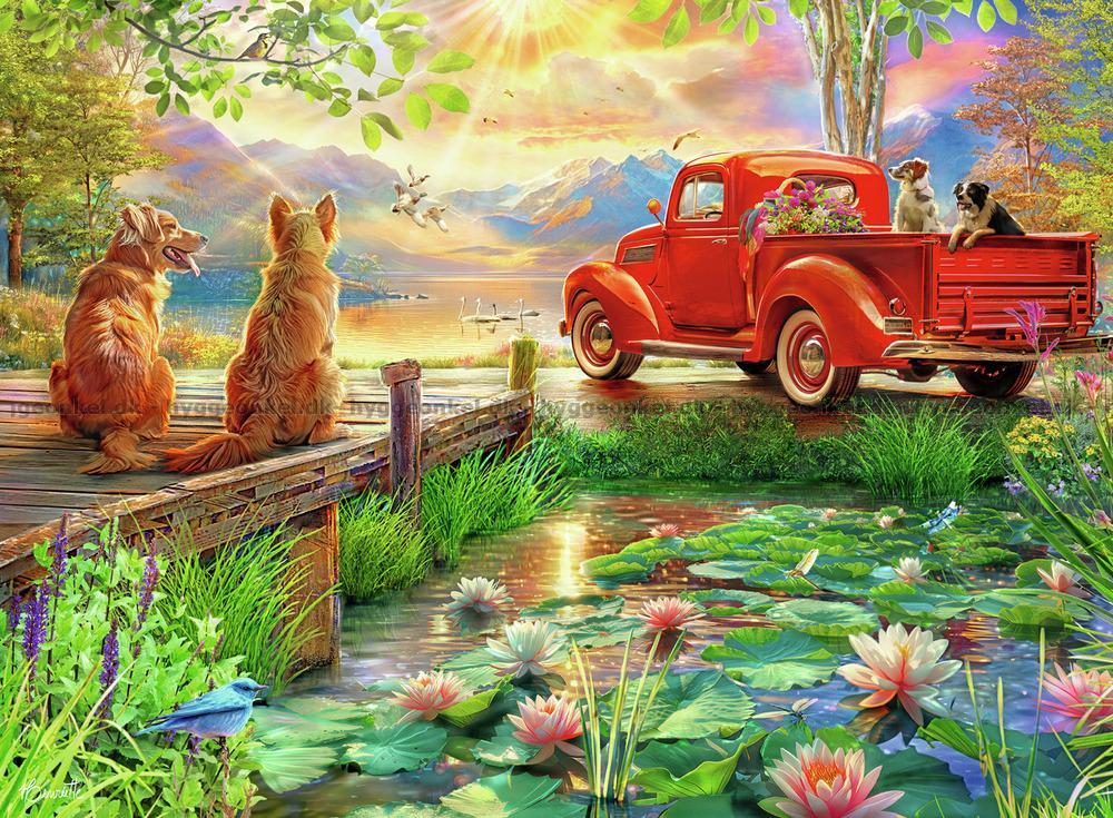 - På planet til den røde lastebilen sitter to hunder og ser nysgjerrig utover landskapet