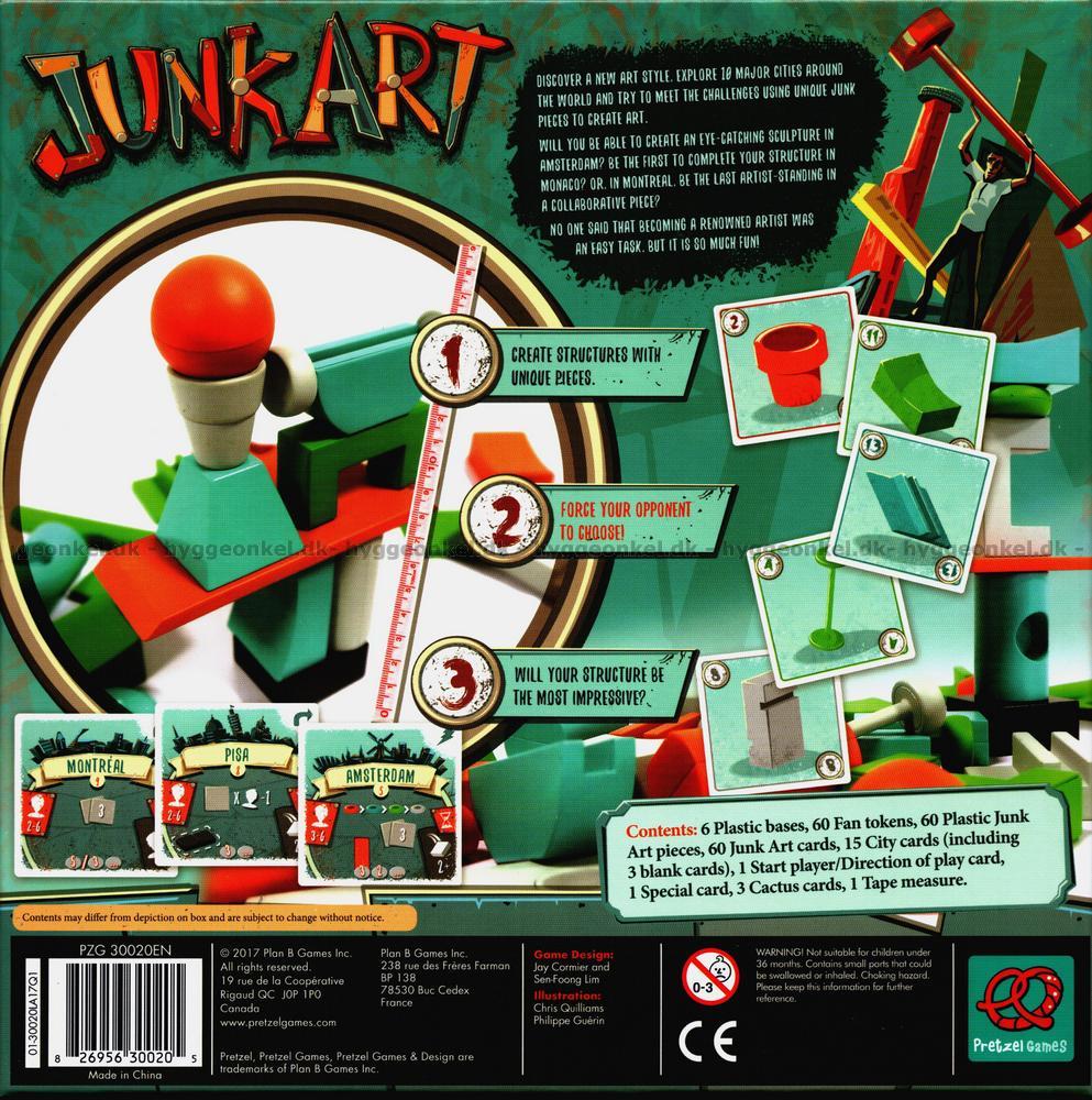 Junk Art kommer med mer enn ti ulike måter å spille på, samt mer enn 60 store, fargestrålende plastkomponenter. I én versjon av spillet lager spillerne en stor bunke av klossene midt på bordet og får utdelt et antall kort, hvert med bilde av en av klossene. Ved sin tur gir spilleren to kort til spilleren til venstre. Denne spilleren skal så ta det ene kortet opp på hånden, mens klossen som matcher det andre kortet brukes til å bygge et tårn. Hvis noe faller ned, blir det liggende på bordet mens spilleren fortsetter å bygge på det som fremdeles står. Når spillerne er ferdige med å spille sine kort, vinner spilleren med det høyeste kunstverket.
