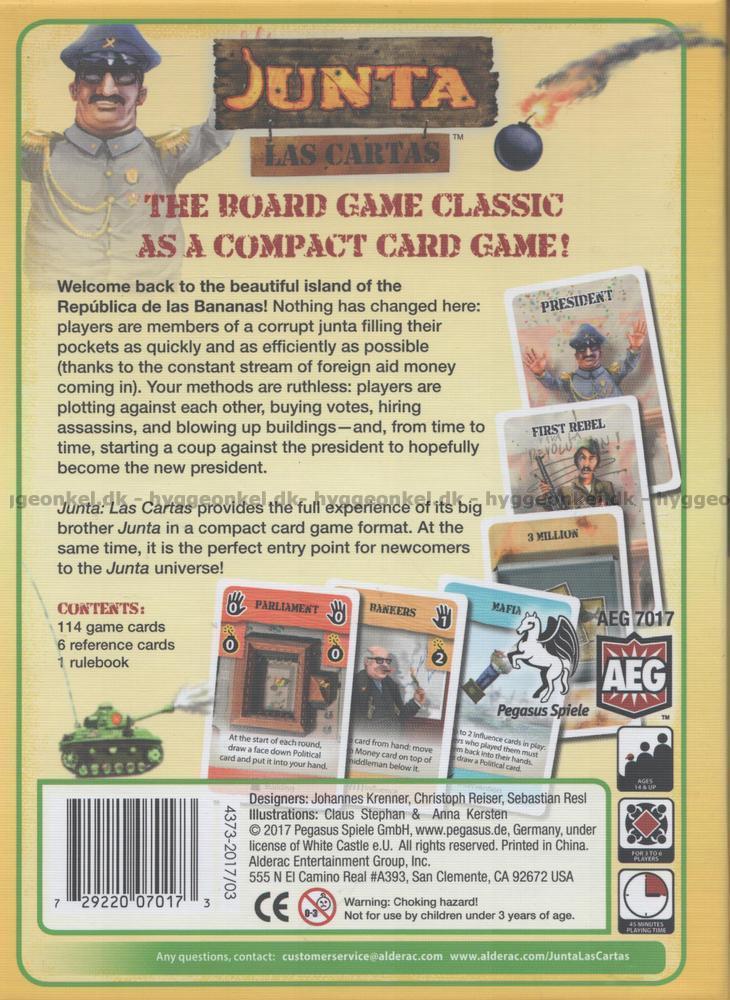 Bli en del av juntaen og kanskje til og med republikkens president i denne utgaven av Junta, som spilles med kort. Målet og midlene er de samme som i brettspillutgaven av Junta.