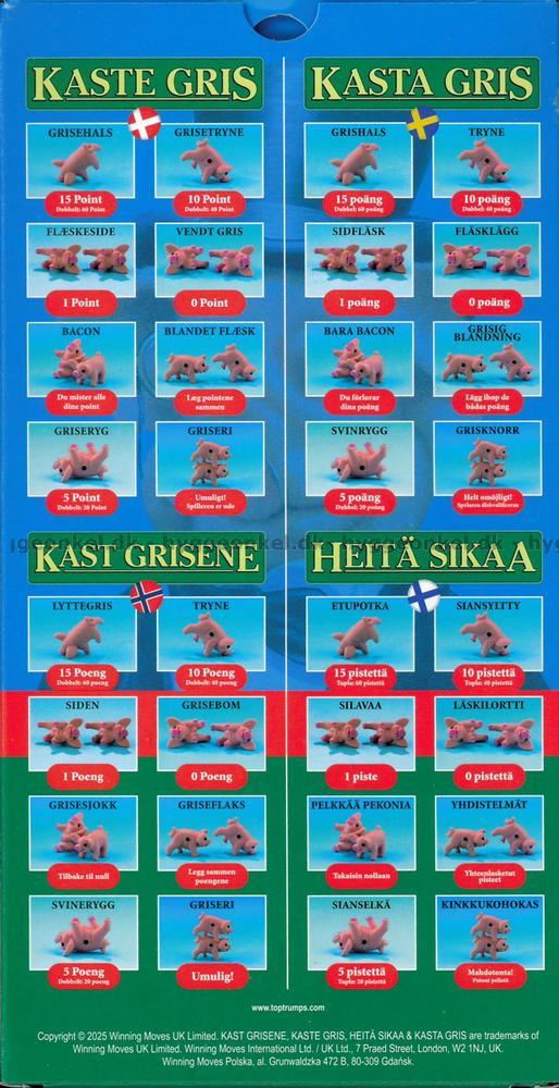 I esken er det en fin liten boks i grå plast. Inne i denne finner du de to famøse grisene (i visse kretser kjent som Pelle og Polle), 2 blyanter, poengblokk samt spilleregler som angir hva de ulike kastene gir av poeng.