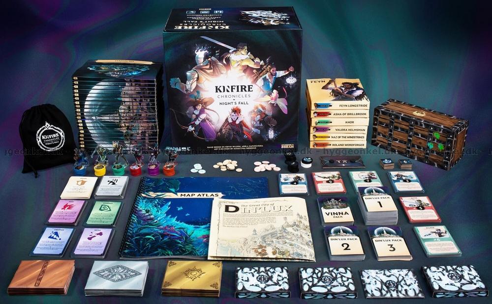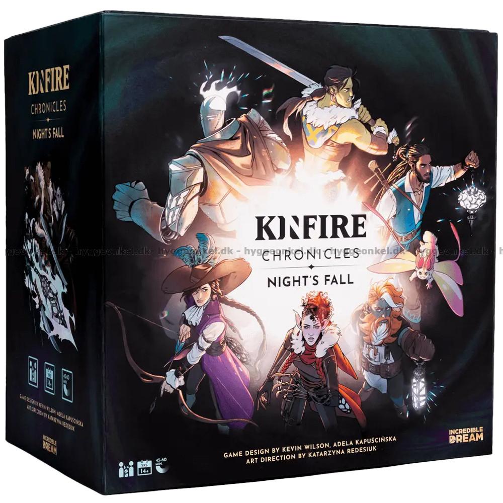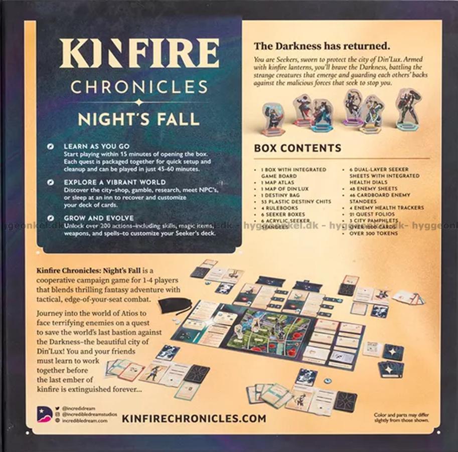 Samarbeid er nøkkelen i Kinfire Chronicles: Night's Fall. Dere må ta strategiske beslutninger som gruppe og støtte hverandre i kamp for å overvinne utfordringene dere står overfor. Spillet inneholder vakkert designede komponenter, inkludert detaljerte heltefigurer, spillekort og et spillebrett som bringer hver helts evner og historie til live.