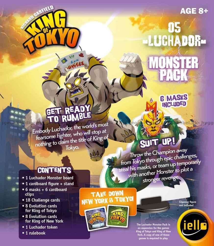 Gjør deg klar til kamp i ringen med King of Tokyo: Luchador Monster Pack! Denne utvidelsen til King of Tokyo bringer nye måter å kjempe, samarbeide og vinne på. Luchador, verdens mest fryktinngytende bryter, trer inn i arenaen med ett mål for øye – å bli den ubestridte King of Tokyo.