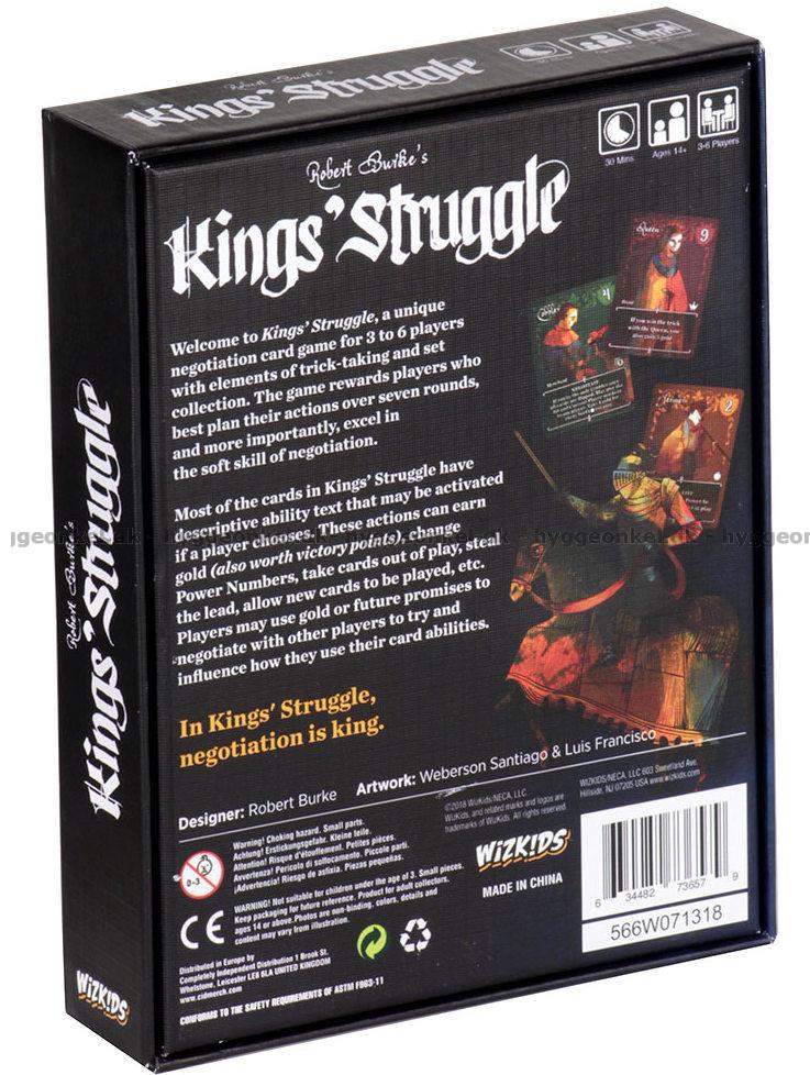 Velkommen til Kings’ Struggle, et kortspill hvor du skal ta stikk, forhandle og samle sett av like kort. Spillets regler er simple: hver spiller spiller ett kort hver runde, og spillet varer kun syv runder. I løpet av de syv rundene kjemper spillerne om å vinne kort gjennom forhandling og å ta stikk.