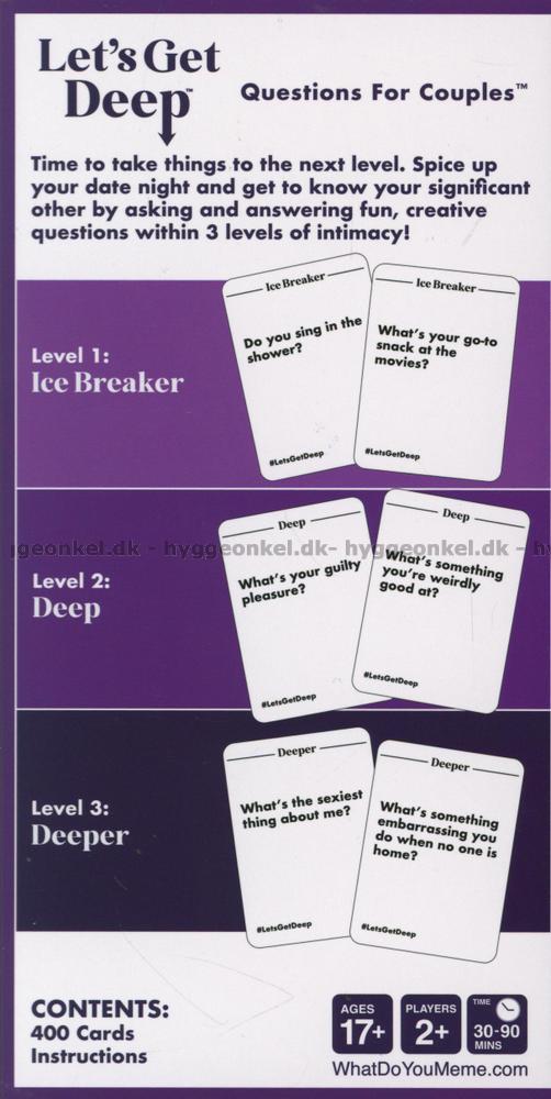 Esken inneholder 400 kort. Teksten på kortene er på engelsk. Det medfølger engelske instruksjoner.
