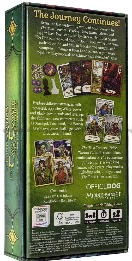 Reisen gjennom Midgard fortsetter i Lord of the Rings: The Two Towers – Trick-Taking Game, et stemningsfullt og historiedrevet kortspill hvor spillerne inntar rollene som helter og skurker fra Tolkiens klassiske fortelling. Spillet er en selvstendig fortsettelse til The Fellowship of the Ring: Trick-Taking Game og dekker kapitlene 19-36 fra den episke historien. Hvert kapittel byr på nye utfordringer, hvor spillerne må oppfylle spesifikke betingelser for sine karakterer for å komme videre i historien.