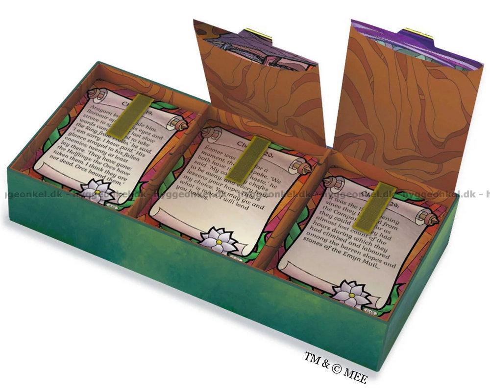 Underveis introduseres nye figurer, gjenstander og prøvelser, som hele tiden endrer spillets dynamikk. Den Ene Ringen fungerer som spillets eneste trumfkort, men kan først spilles når et kort utenfor farge er lagt. Med The Two Towers – Trick-Taking Game kan du dykke enda dypere inn i Tolkiens univers og oppleve kampen om Midgard på en ny og intens måte.
