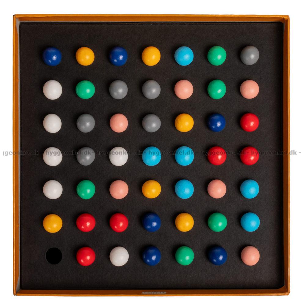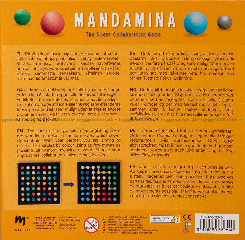 Mandamina er et fascinerende samarbeidsspill hvor spillerne må jobbe sammen – helt uten å snakke – for å organisere trekulene på brettet etter farge.