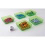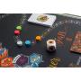 Spillebrett, kort, markører, terning og trebrikker.
