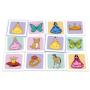 54 pappbrikker som passer sammen parvis. Hver brikke måler 6 x 6 cm. Brikkene har flotte tegninger av blant andet prinsesser og sommerfugler.