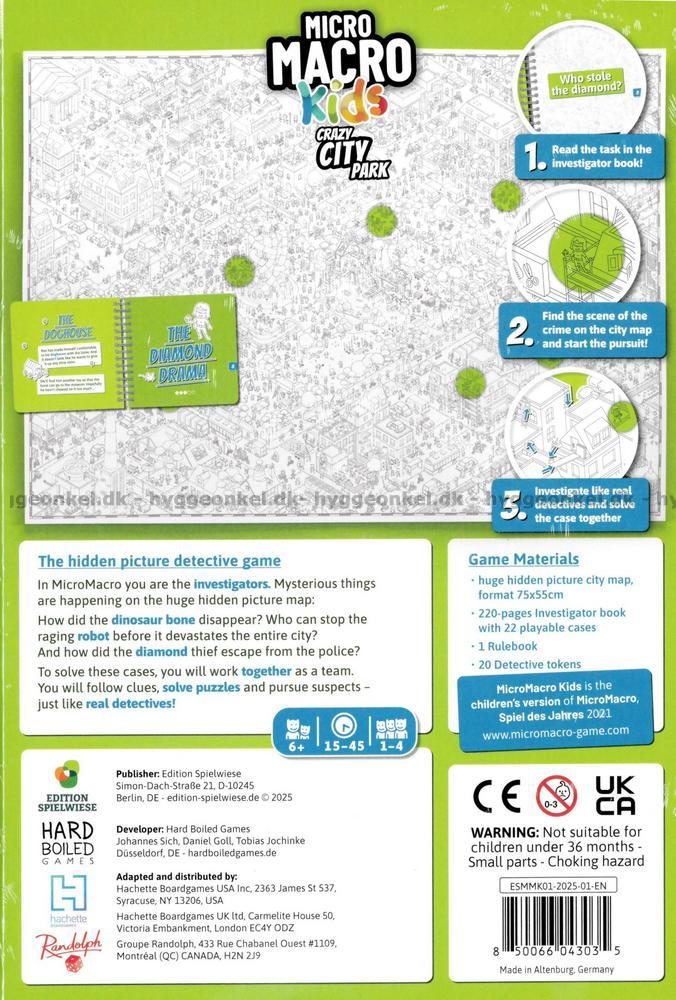 I MicroMacro: Kids – Crazy City Park blir dere ekte små detektiver i en fargerik og livlig by full av morsomme mysterier. På det store kartet over Crazy City Park yrer det av liv, og overalt skjuler det seg små historier, merkelige hendelser og gåtefulle spor. Deres oppgave er å løse 22 spennende saker ved å se nøye på kartet, finne sammenhenger og avsløre hva som egentlig har skjedd.