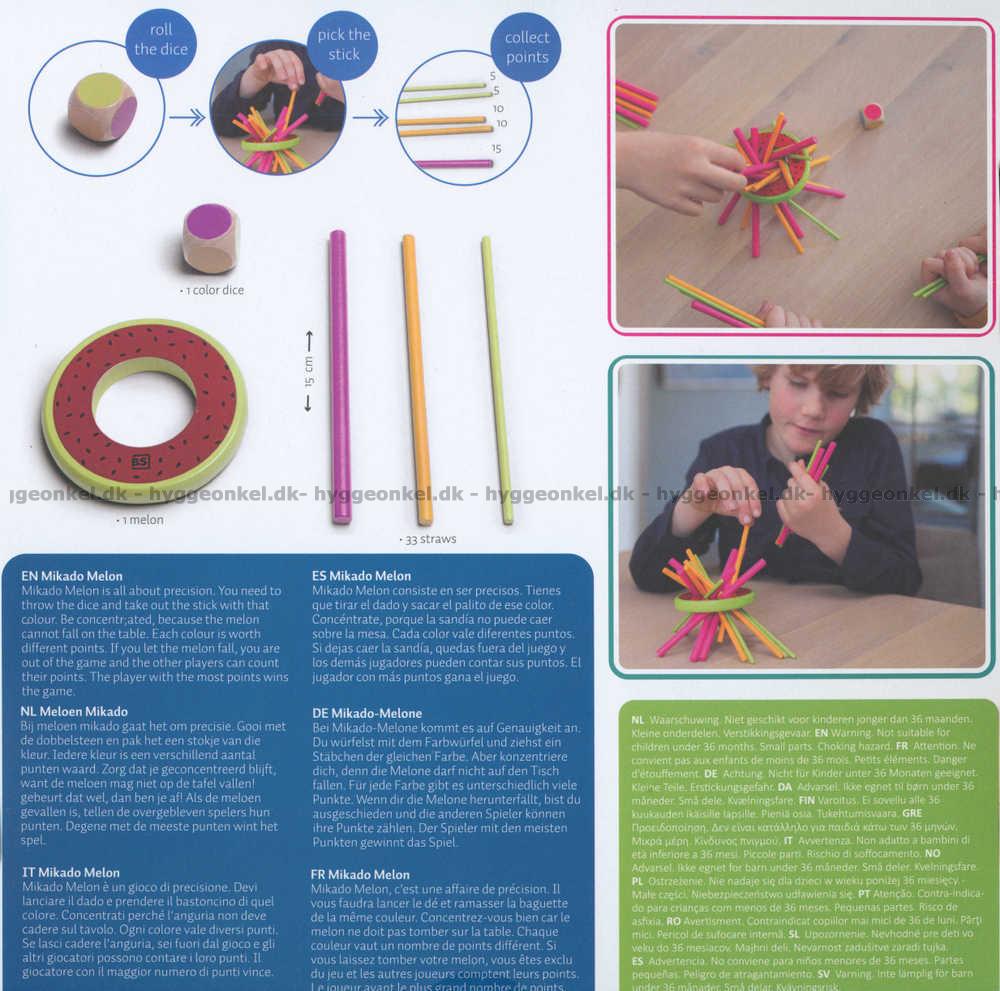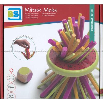 Plasser pinnene i melonen. Kast terningen og se om du klarer å trekke ut en pinne med den fargen som terningen viser.