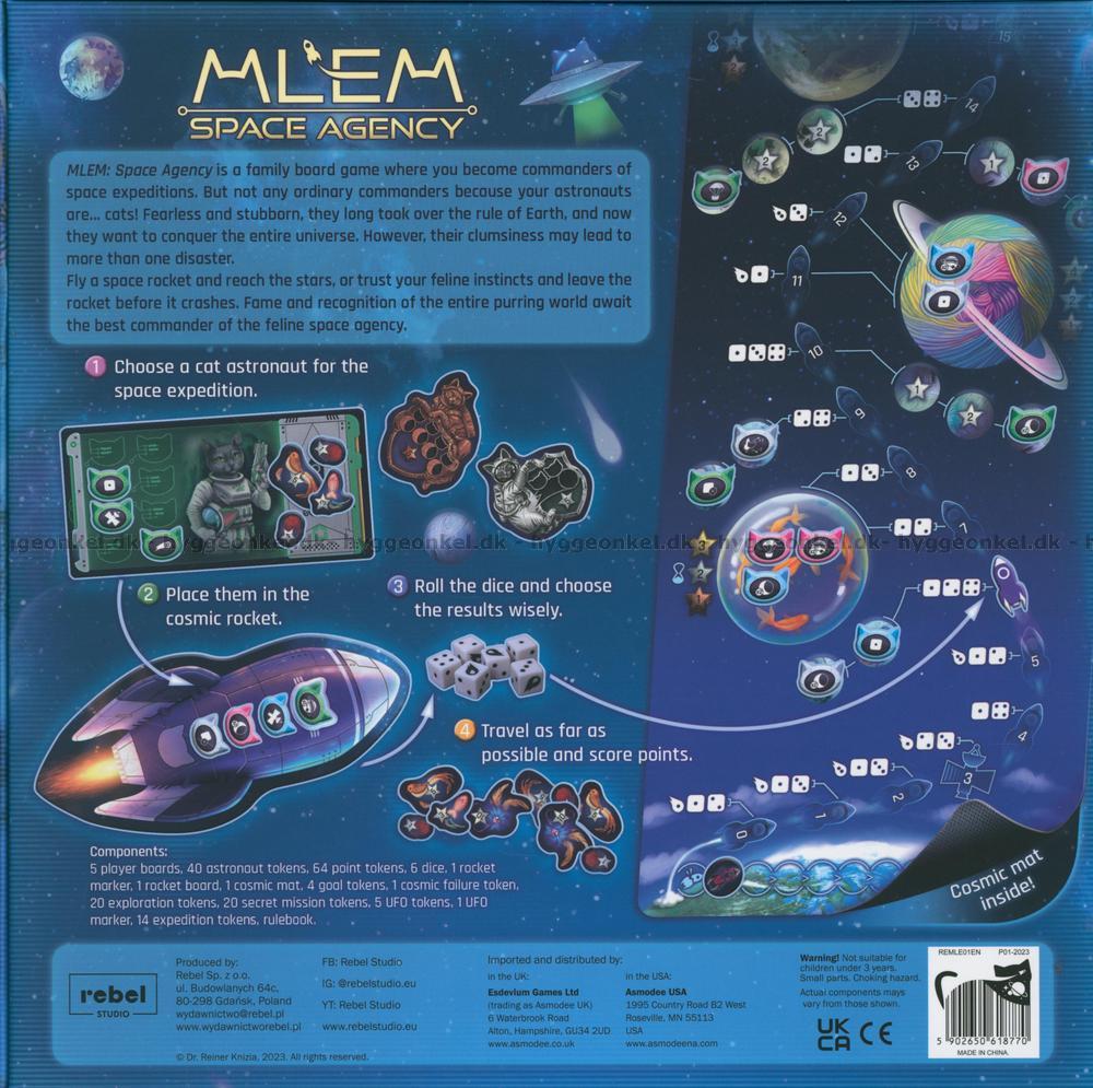 Dykk ned i en fortryllende fremtid i år 2075, hvor katter ikke kun har erobret Jorden, men nå setter sine klør i intet mindre enn det uendelige verdensrommet! MLEM: Space Agency er et familiebrettspill hvor man spiller som modige kapteiner for kosmiske eksped-isjoner, med en vri; disse fryktløse oppdagelses-reisende er katter!