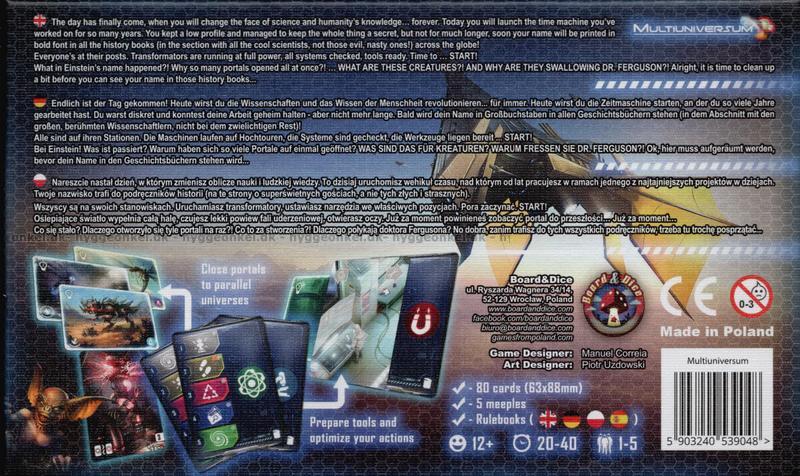 Multiuniversum er et kortspill hvor spillere bruker kortene sine til å utføre handlinger som å forske, flytte mellom de fem modulene i Hadron Collider'en og gjøre verktøy klare slik at dere kan lukke portalene til de fantastiske, men faretruende dimensjonene.