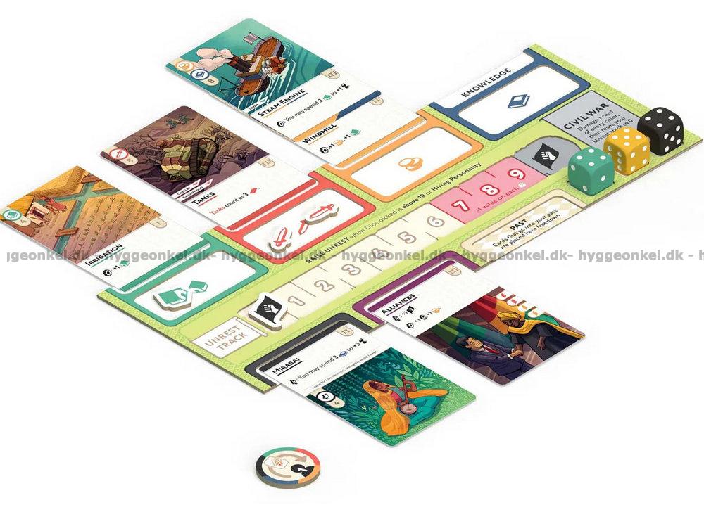 Hver runde velger du terninger og bruker dem klokt til å utvikle kunnskap, skaffe ressurser og ta viktige beslutninger som påvirker hele nasjonens skjebne.