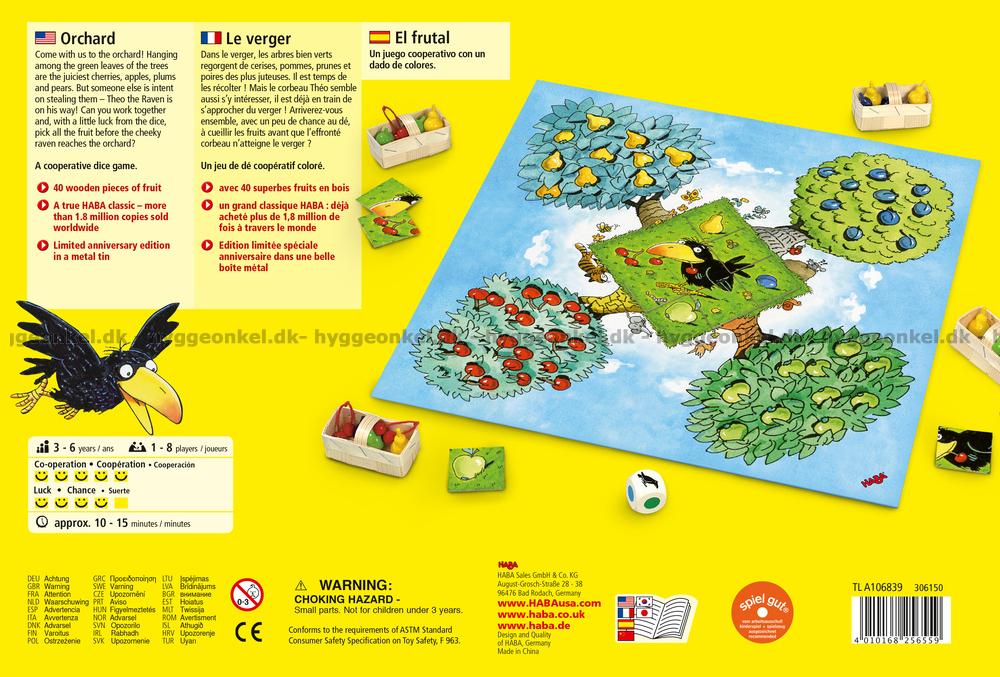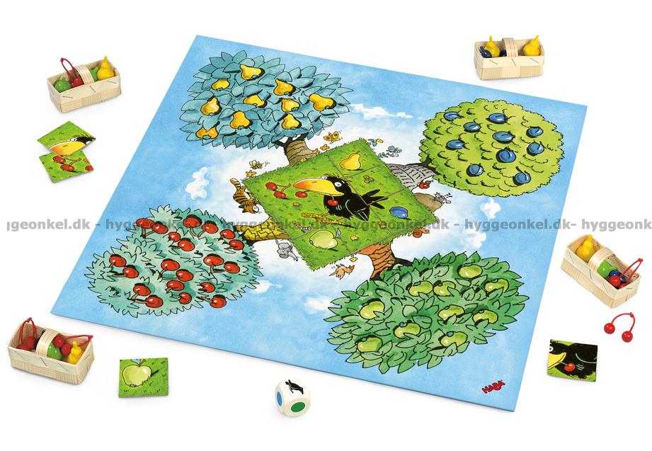 Trefrukter, fruktkurver, terning (3 x 3 x 3 cm) og spillebrett (ca. 48 x 48 cm).