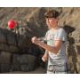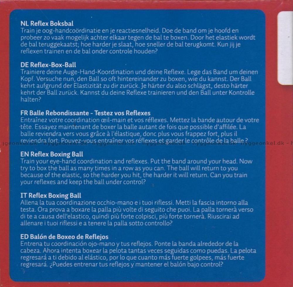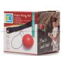 1 justerbart pannebånd (måler 64 x 4 cm) hvorpå det er festet et elastisk bånd (måler 42 cm) med en ball (ballen i plast har en diameter på 9 cm).