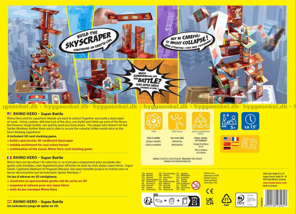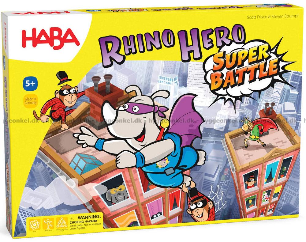 Med fire fargerike heltfigurer, hengende edderkoppeaper og et uforutsigbart byggverk er hvert spill en ny utfordring. Rhino Hero: Super Battle er en frittstående oppfølger til den populære Rhino Hero, full av action, balansekunst og latter for hele familien – og med ekstra varianter for dem som ønsker en enda vanskeligere utfordring.