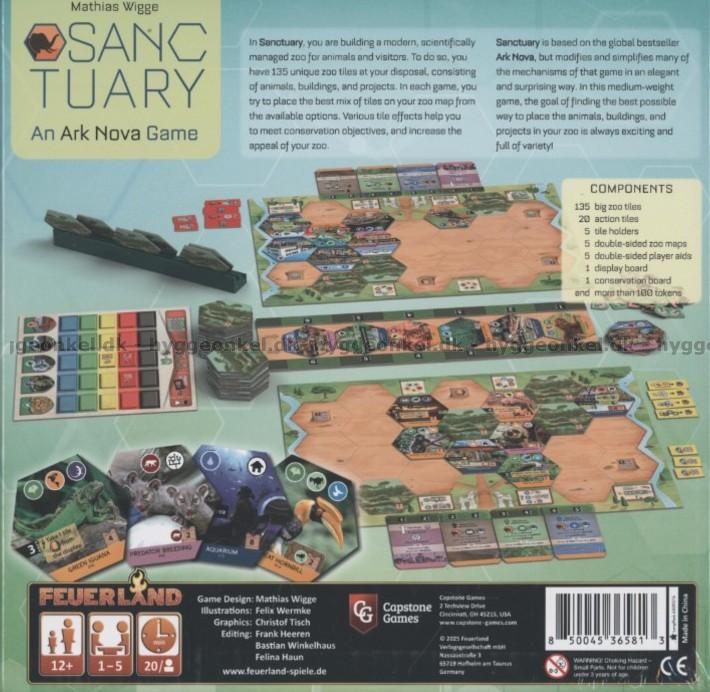 I Sanctuary trer dere inn i rollen som grunnleggere av en moderne dyrepark med en klar visjon om å skape et trygt og bærekraftig fristed for dyr fra hele verden. Foran dere ligger et tomt dyrepark-kart, som gradvis skal forvandles til et levende landskap fylt med dyr, bygninger og engasjerende bevaringsprosjekter. Hver brikke dere plasserer, blir en del av fortellingen om deres helt egen dyrepark.
