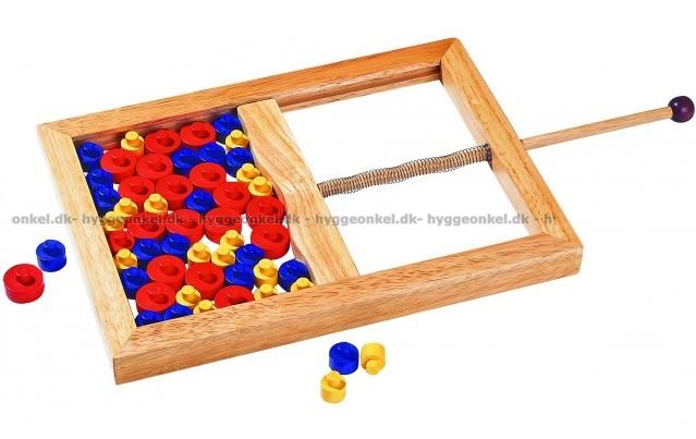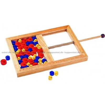 Esken inneholder selve fellen samt en bunke brikker fordelt på tre størrelser og farger.