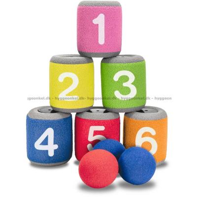Her får du seks bokser og fire baller i skumgummi til å kaste med.