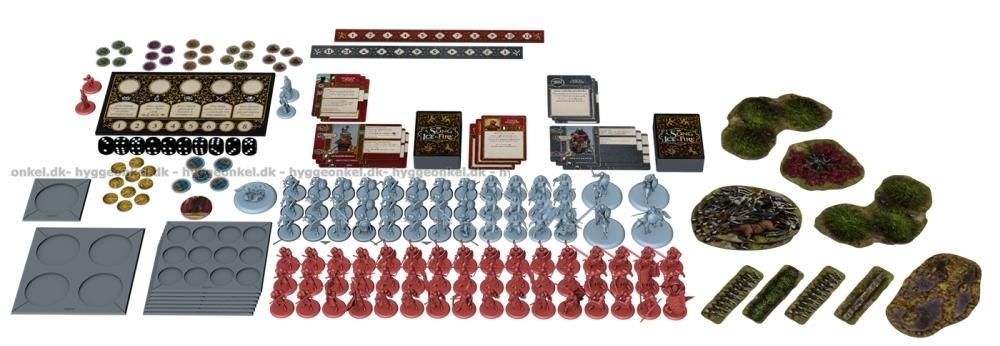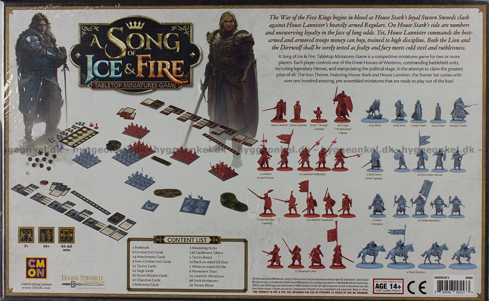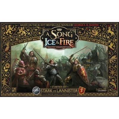 A Song of Ice & Fire er et miniatyrspill for to eller flere spillere. Hver spiller styrer en av Westeros' mektige adelsfamilier og har kontroll over deres tropper, legendariske helter og det politiske spillet i kampen om Jerntronen. Dette begynnersettet inneholder Stark- og Lannister-familiene og kommer med mer enn 100 flotte figurer som kan brukes direkte fra esken! De er basert på originale illustrasjoner til spillet med rådgivning fra forfatter George R.R. Martin og Dark Sword Miniatures,