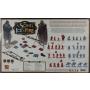 Kort, markører, terninger og miniatyrfigurer i plast.