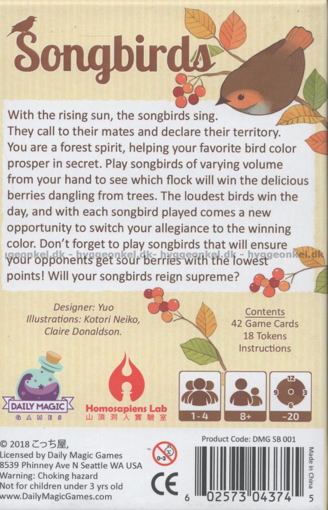 Songbirds er et kortspill om fugler som forsøker å få dominans over skoven. Hver fugl har sin egen farge.