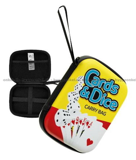 Det er plass til 2 vanlige sett med spillekort og 5 terninger i esken.