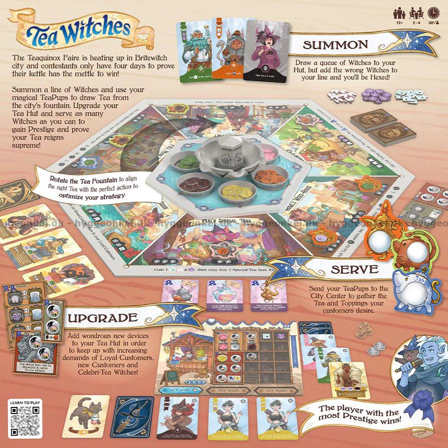 I Tea Witches inntar dere rollen som te-hekser under den magiske Teaquinox-messen. Over fire dager konkurrerer dere om å oppnå mest mulig prestisje ved å tiltrekke lojale hekser, brygge og servere te, gjennomføre takeaway-bestillinger og bygge ut deres egen tebod i byens sentrum. Hver dag er delt inn i tre faser, hvor dere først tilkaller hekser fra deres personlige kortbunke, deretter beveger dere dere rundt i byen med te-hjelperne deres for å samle ingredienser og utføre handlinger, og til slutt klargjør boden til neste dag.