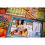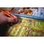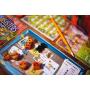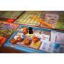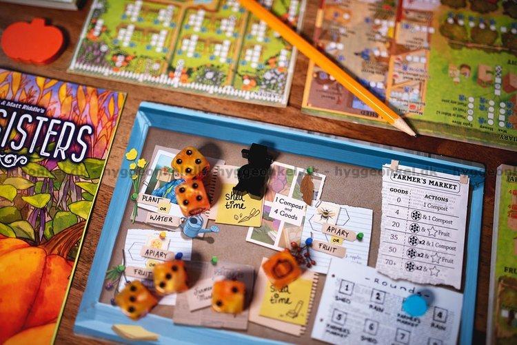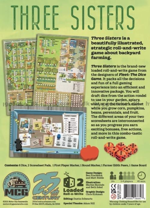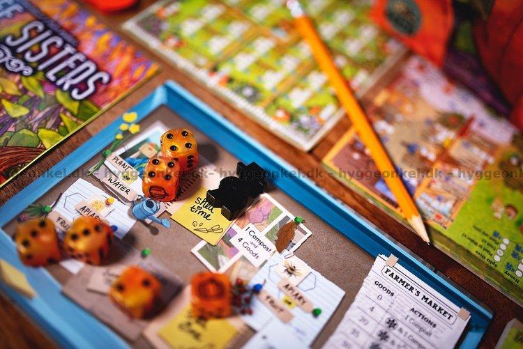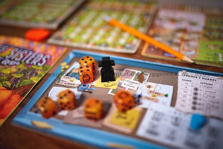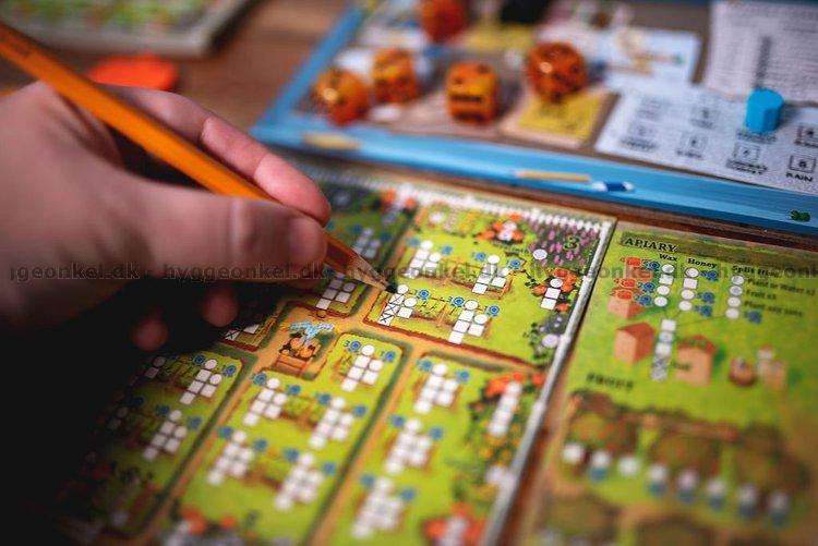 6 terninger, tremarkører, spillområde og poeng-blokker.