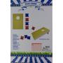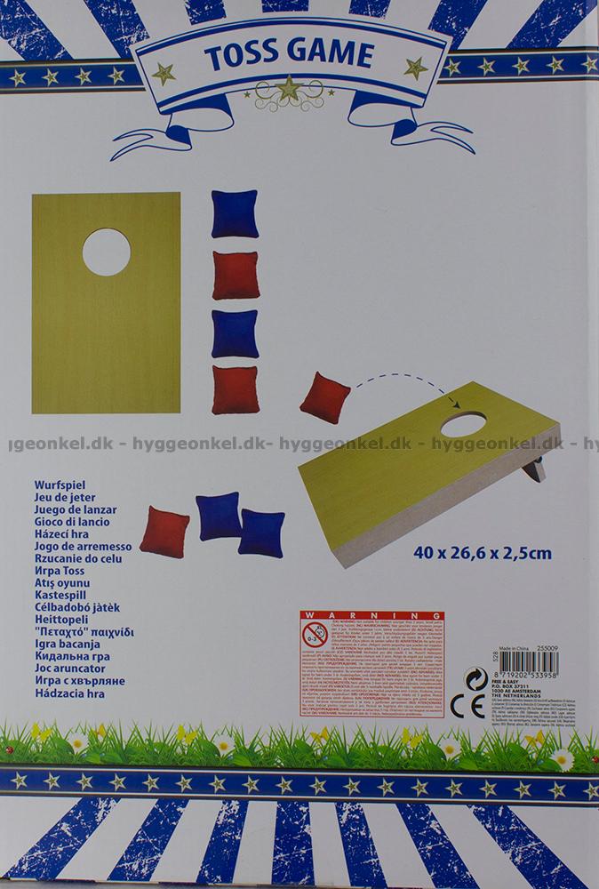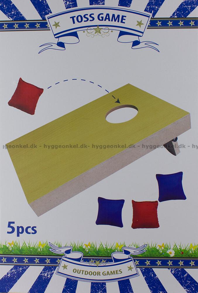1 trebrett som måler 39 x 26 x 2,5 cm og 4 erteposer (2 blå og 2 røde).