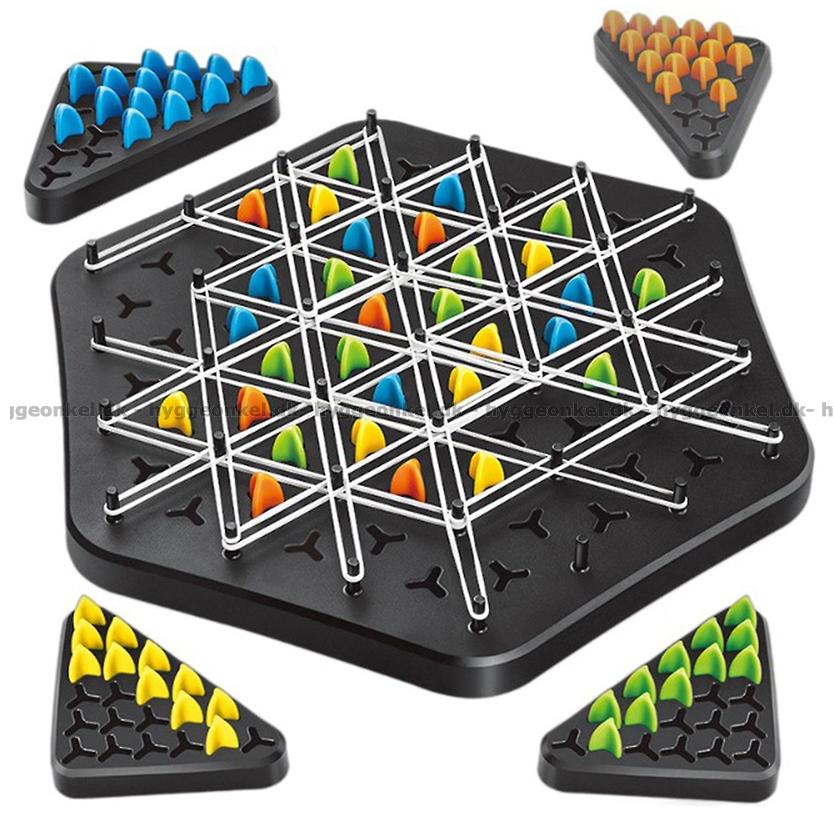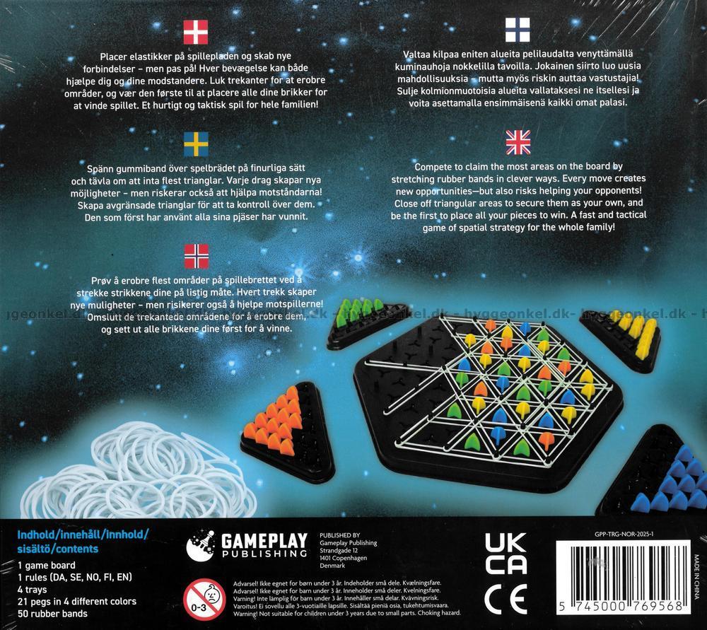 Hver spiller fester en strikk mellom fire punkter, og når en trekant lukkes, kan du markere den som din med en farget brikke.