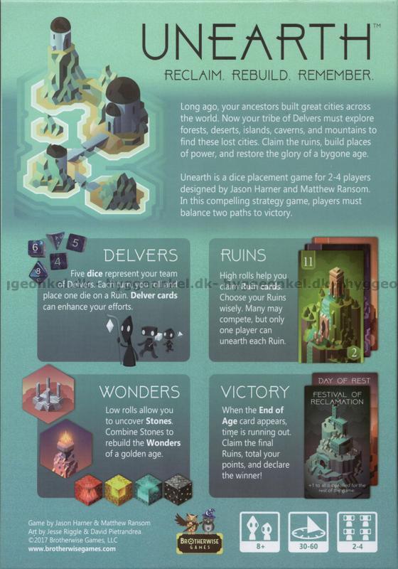 Unearth er et spill hvor du virkelig skal prøve lykken, plassere dine terninger og samle på sett. Spillet er utviklet av Jason Harner og Matthew Ransom, tar under en time å spille og er for 2-4 spillere. Hver spiller har en stamme av Delvers, representert ved fem terninger (3 seksidede, 1 firesidet og 1 åttesidet). Spillerne bytter på å kaste sine terninger og plassere dem i et forsøk på å gjøre krav på ruinene.