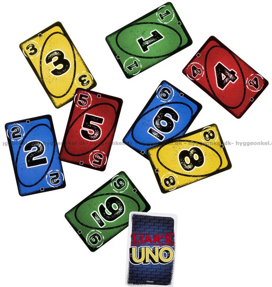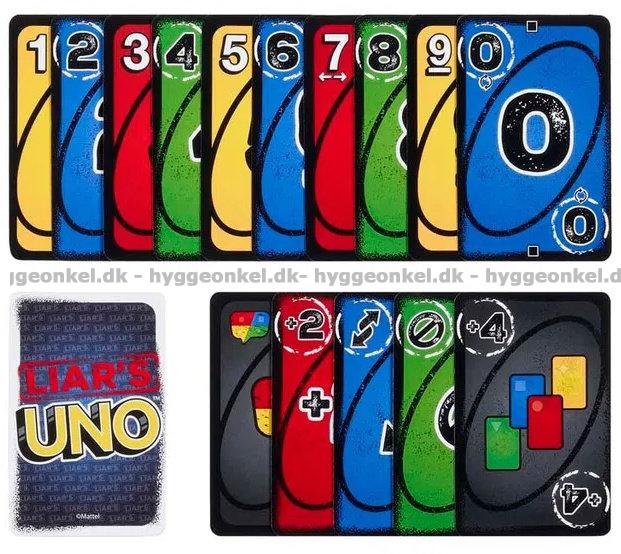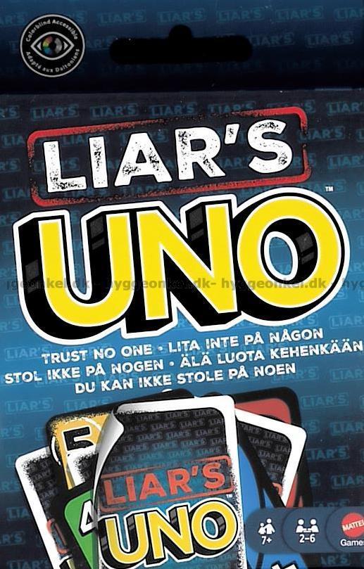 Uno: Liar’s er en underholdende vri på det klassiske kortspillet, hvor små løgner og dristige bløff er en helt naturlig del av spillet. Her blir et Liar’s-kort spilt med baksiden opp, mens spilleren erklærer hvilket kort det skal forestille, og spenningen stiger når de andre skal vurdere om sannheten blir sagt, eller om det bløffes. Blir en spiller avslørt i å lyve, må vedkommende trekke et kort, men hvis anklagen var feil, er det anklageren som straffes. Spillet handler om å holde masken, skjule sine avslørende trekk og spille kortene sine med kløkt, samtidig som man selvfølgelig husker å rope UNO når man bare har ett kort igjen.