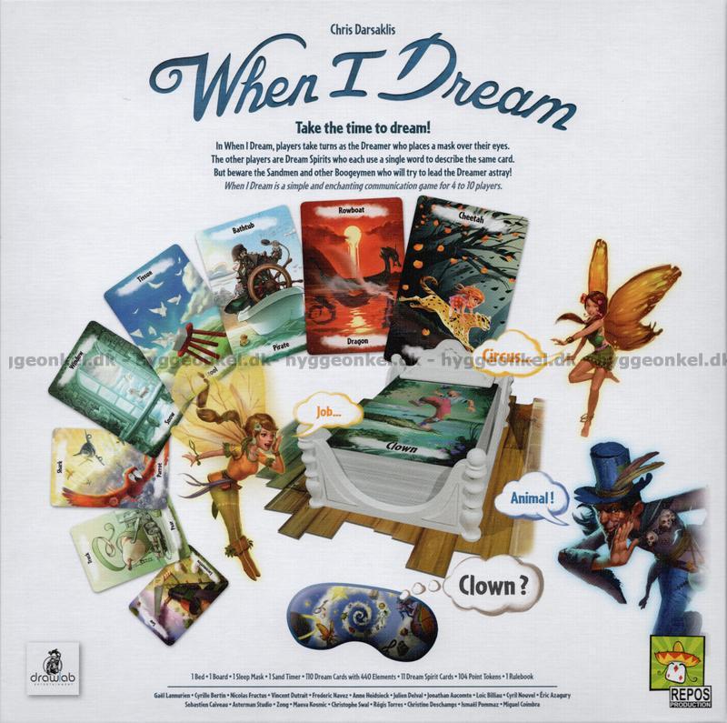 1 seng, 1 sovemaske, 1 timeglass, 110 drømmekort med 440 elementer, 11 drømmeåndkort og poengbrikker.