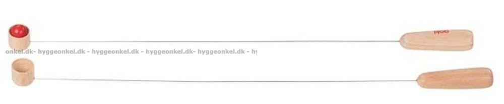2 lange (og livlige) pinner. I den ene enden er det et trehåndtak, i midten en lang metallstang og den andre enden en fordypning. Pinnene måler 45 cm i alt. Metallstangen måler ca. 35 cm.