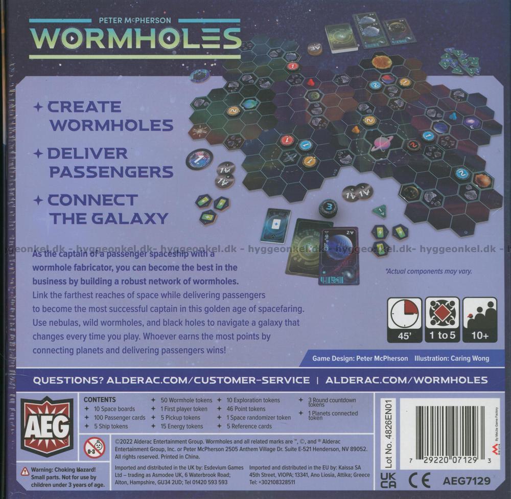 Wormholes er et strategisk brettspill hvor du som kaptein på et passasjerskip i rommet, utstyrt med avansert ormehullsteknologi, skal bygge et nettverk av ormehull for å forbinde ulike deler av galaksen. Målet med spillet er å transportere passasjerer og plassere ormehull taktisk for å tjene poeng. Spillet tilbyr en blanding av strategi og taktikk med elementer som passasjerkort, ormehull-brikker og ulike spillebrett som simulerer verdensrommet. Wormholes byr på en engasjerende og dynamisk spillopplevelse for både venner og familie.