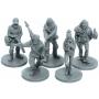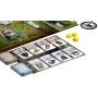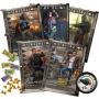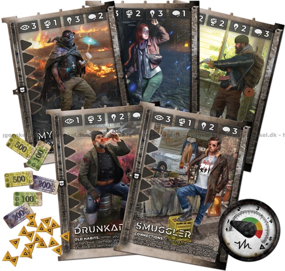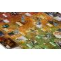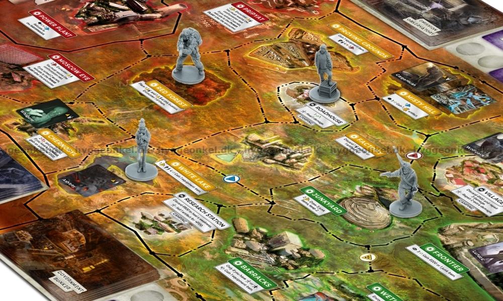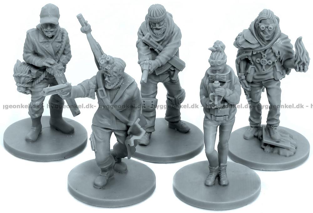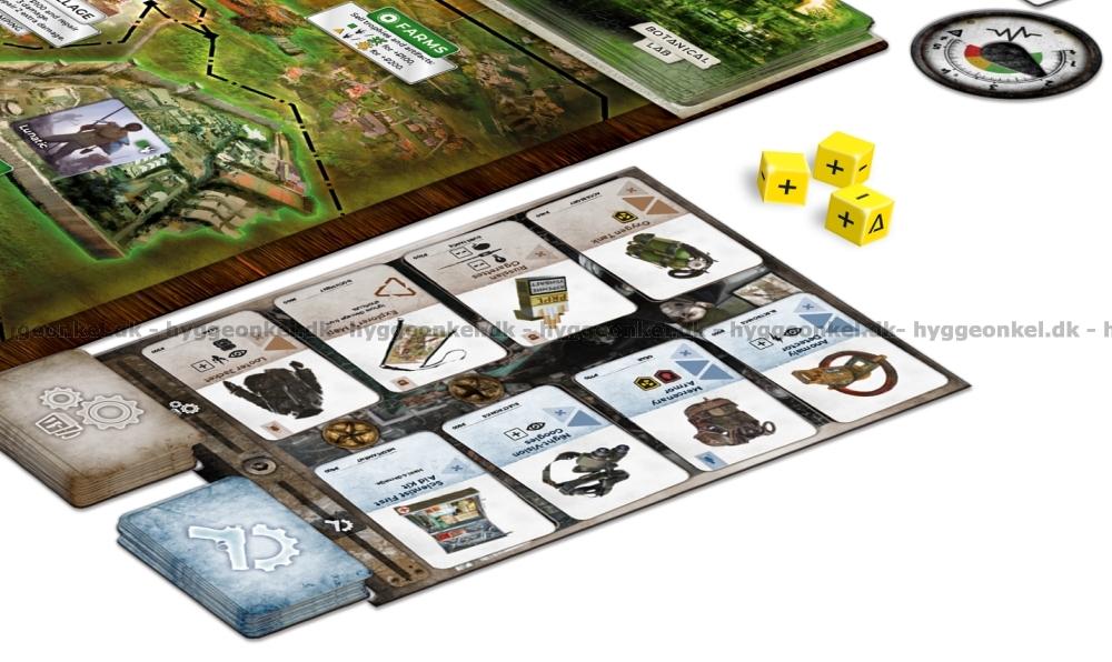 Spillebrett, miniatyrfigurer i plast, kort, terninger og markører.